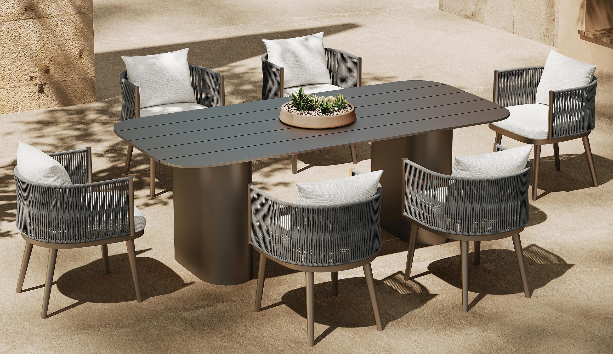 Inspired by the graceful movement of ripples in water, its design features soft, flowing lines that create an elegant and inviting look. It is not just a piece of furniture but a statement of refined outdoor living, inviting people to relax and savor the beauty of nature while dining in style.